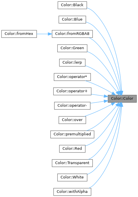 The Color class stores red, green, blue, and alpha components as floats clamped to the [0,1] range. It provides convenient constructors, conversion utilities to and from 8-bit channel values and hexadecimal strings, as well as basic color operations.